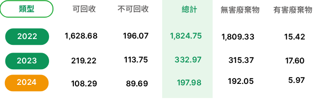 1. 2022年的統計範圍僅包含母公司與集團船隊、2023~2024年的統計範圍包含母公司及合併財務報告所有子公司,部分據點之廢棄物統一由物業處理,故無法統計廢棄物相關數據;